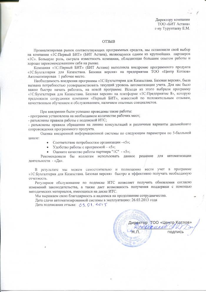 Внедренное решение: Автоматизация бухгалтерского учета в ТОО "Центр Котлов" на базе программного продукта "1С:Предприятие 8. Бухгалтерия для Казахстана.Базовая версия"