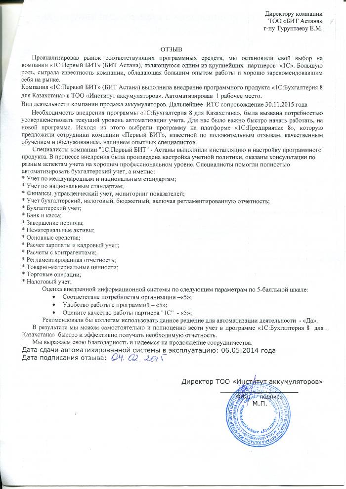Внедренное решение: Автоматизация бухгалтерского учета в ТОО "Институт аккумуляторов" на базе программного продукта "1С:Предприятие 8. Бухгалтерия для Казахстана"