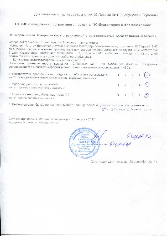 Клиент: Товарищество с ограниченной ответственностью «Алатау Логистик Астана»