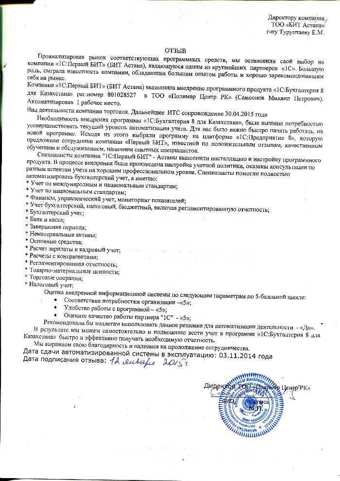 Внедренное решение: Автоматизация бухгалтерского учета в ТОО "Полимер Центр РК" (Самсонов Михаил Петрович) на базе программного продукта "1С:Бухгалтерия 8 для Казахстана"