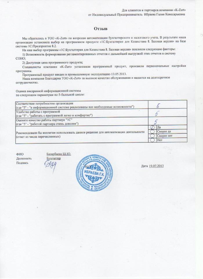 Внедренное решение: ИП Ибраева Г.К. автоматизировала бухгалтерский и налоговый учёт на базе ПП "1С:Бухгалтерия 8 для Казахстана. Базовая версия"