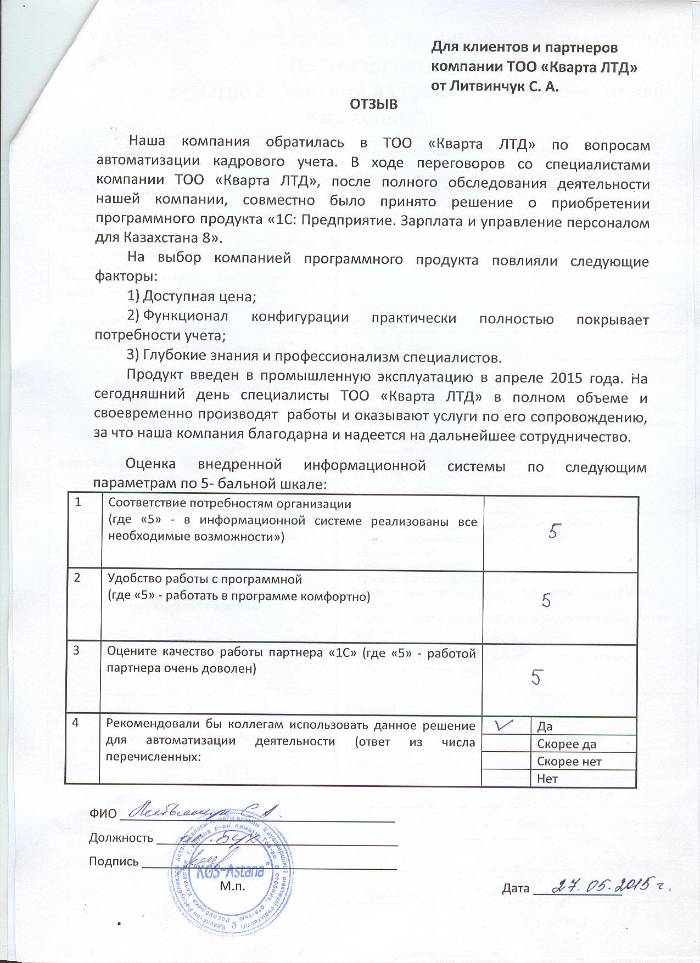 Отзыв клиента на внедренное решение