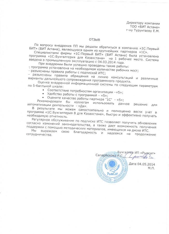 Внедренное решение: Автоматизация бухгалтерского учета у индивидуального предпринимателя Рымсат на базе программного продукта "1С:Предприятие 8. Бухгалтерия для Казахстана"
