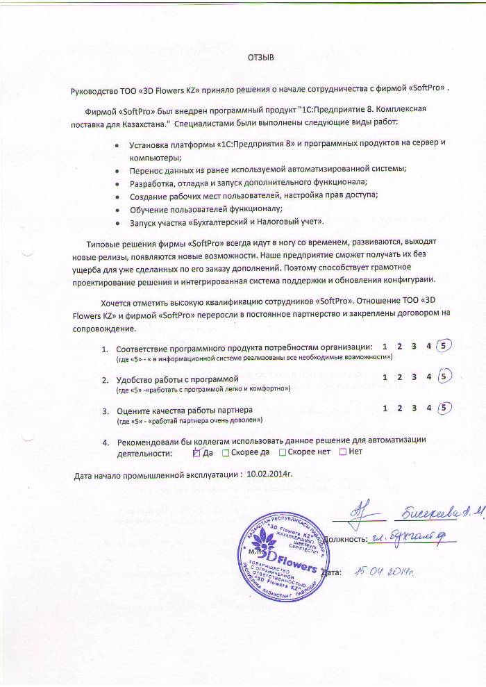 Внедренное решение: ТОО "3D flowers kz" внедрен ПП "1С:Предприятие 8. Комплексная поставка для Казахстана."