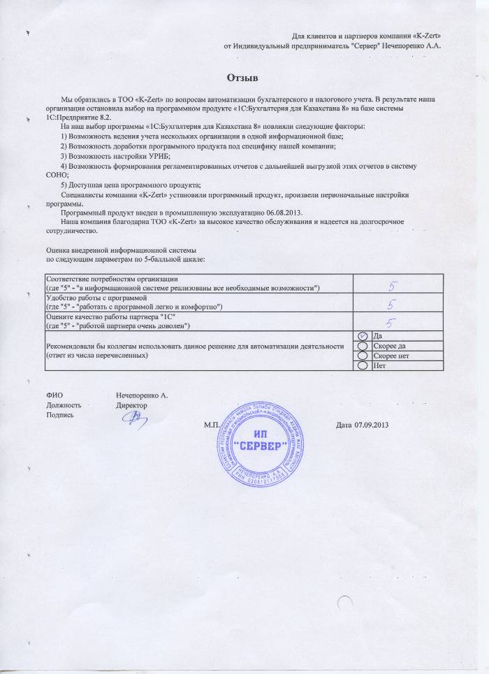Внедренное решение: ИПНечеропенко А.А. автоматизировал бухгалтерский и налоговый учёт на базе ПП "1С:Бухгалтерия 8 для Казахстана"