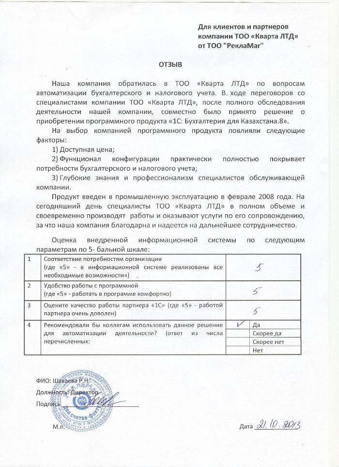 Отзыв клиента на внедренное решение