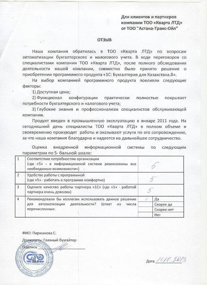 Отзыв клиента на внедренное решение