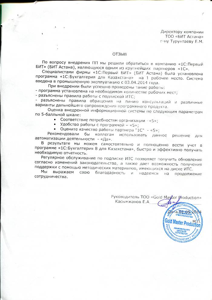 Внедренное решение: Автоматизация бухгалтерского учета в ТОО "Gold Master Production" на базе программного продукта "1С:Предприятие 8. Бухгалтерия для Казахстана"