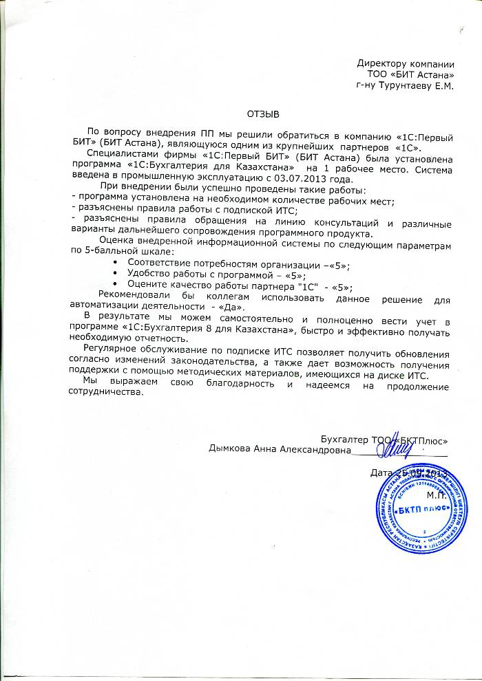 Внедренное решение: Автоматизация бухгалтерского учета в ТОО "БКТПлюс"на базе программного продукта "1С:Предприятие 8. Бухгалтерия для Казахстана"