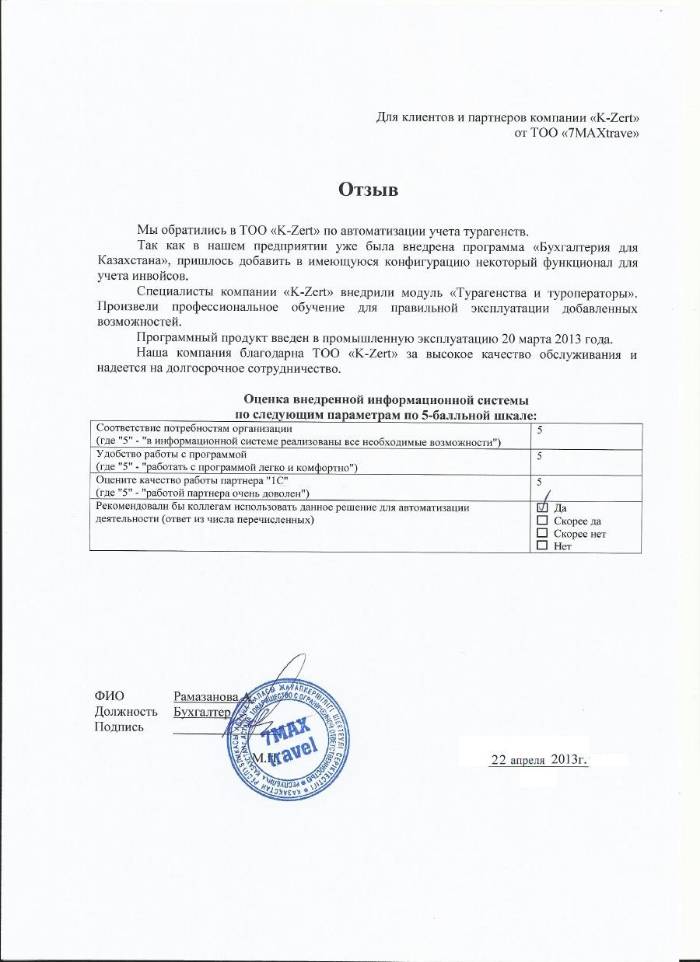 Внедренное решение: В ТОО "7MAXtravel" внедрен модуль "Турагенства и Туроператоры" на базе ПП "1С:Бухгалтерия 8 для Казахстана"