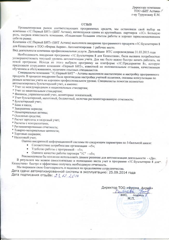 Внедренное решение: Автоматизация бухгалтерского учета на базе программного продукта "1С:Бухгалтерия 8 для Казахстана" в ТОО "Фирма Акрам"