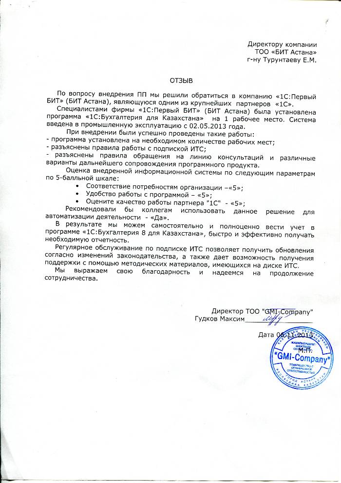 Внедренное решение: Автоматизация бухгалтерского учета в ТОО "GMI-Company" на базе программного продукта "1С:Предприятие 8.Бухгалтерия для Казахстана"