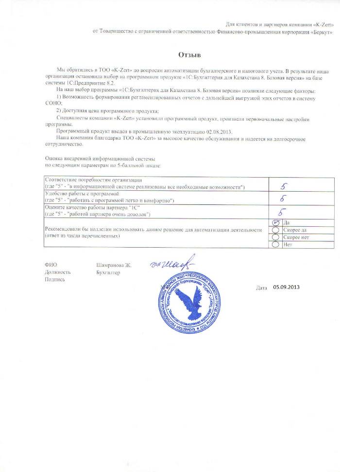 Внедренное решение: ТОО "ФПК Беркут" автоматизировал бухгалтерский и налоговый учёт на базе ПП "1С:Бухгалтерия 8 для Казахстана. Базовая версия"
