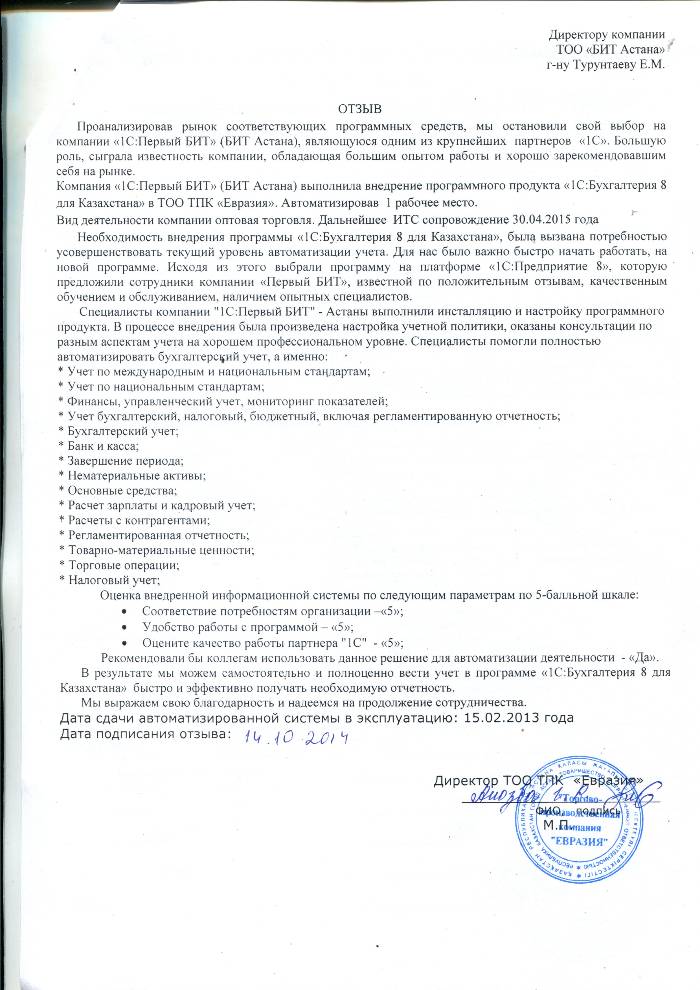 Внедренное решение: Автоматизация бухгалтерского учета в ТОО ТПК "ЕВРАЗИЯ " на базе программного продукта "1С:Бухгалтерия 8 для Казахстана"