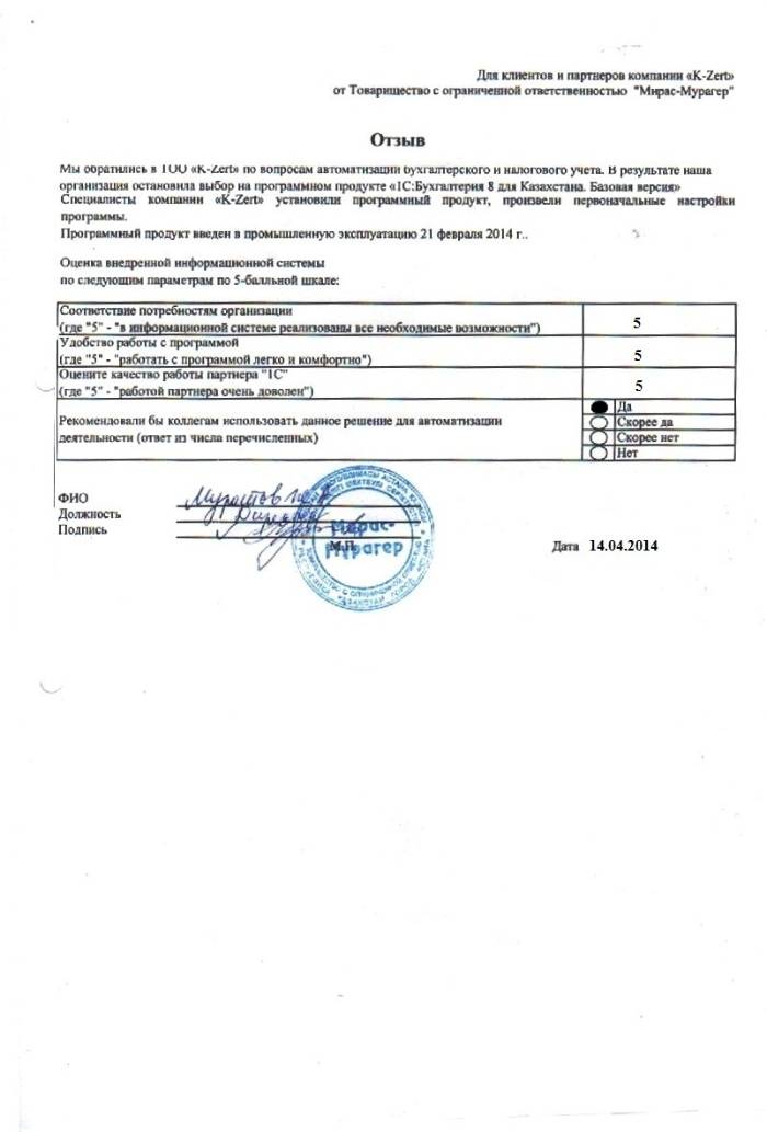 Внедренное решение: ИП "Мирас-Мурагер" автоматизировал бухгалтерский и налоговый учёт на базе ПП "1С:Бухгалтерия 8 для Казахстана. Базовая версия"