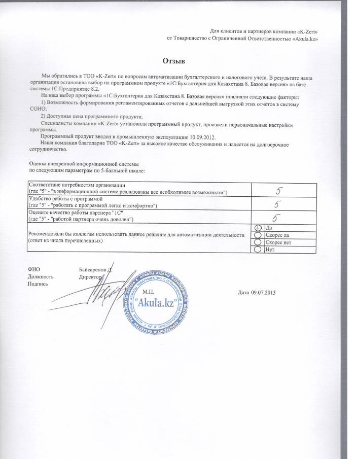 Внедренное решение: Автоматизация бухгалтерского и налогового учёта в ТОО Akula.kz на базе ПП "1С:Бухгалтерия 8 для Казахстана"