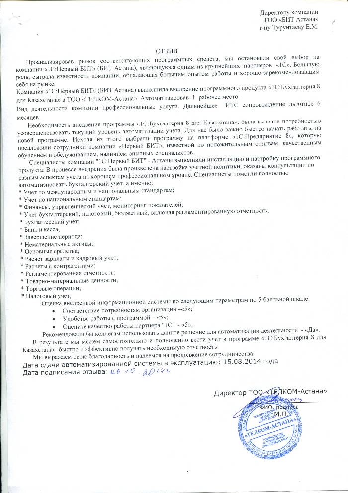 Внедренное решение: Автоматизация бухгалтерского учета в ТОО "ТЕЛКОМ - Астана" на базе программного продукта "1С:Бухгалтерия 8 для Казахстана"