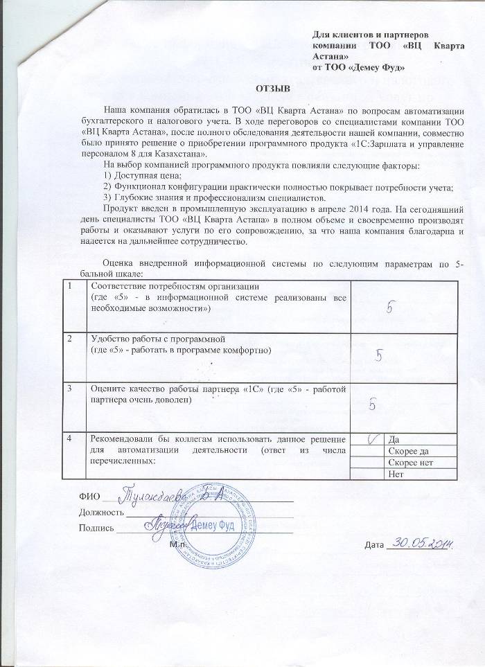 Отзыв клиента на внедренное решение