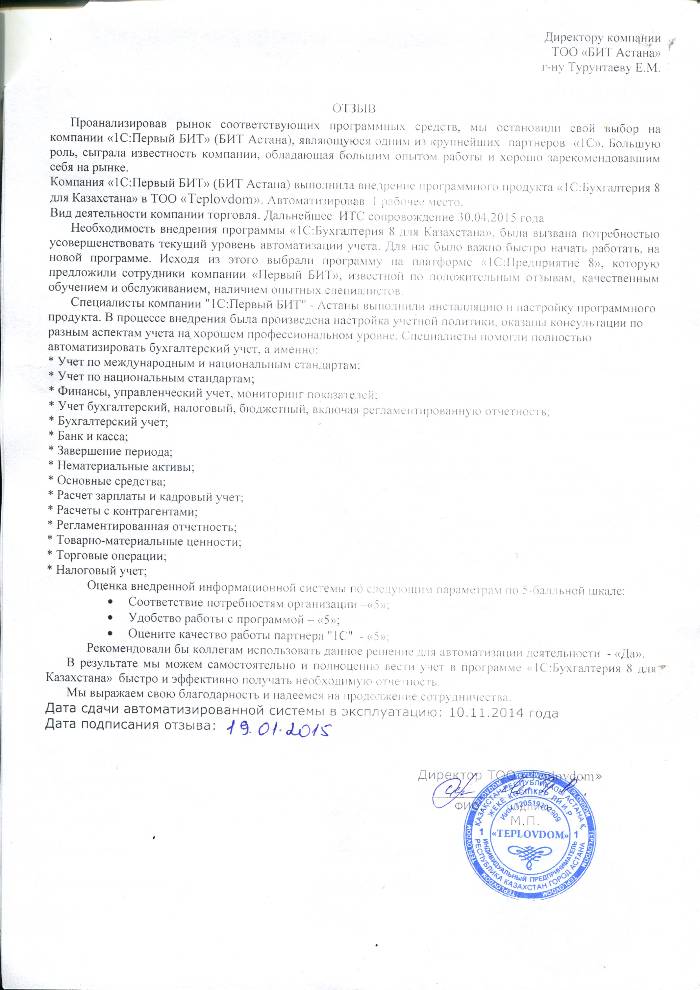 Внедренное решение: Автоматизация бухгалтерского учета в ТОО "Teplovdom" на базе программного продукта "1С:Бухгалтерия 8 для Казахстана"