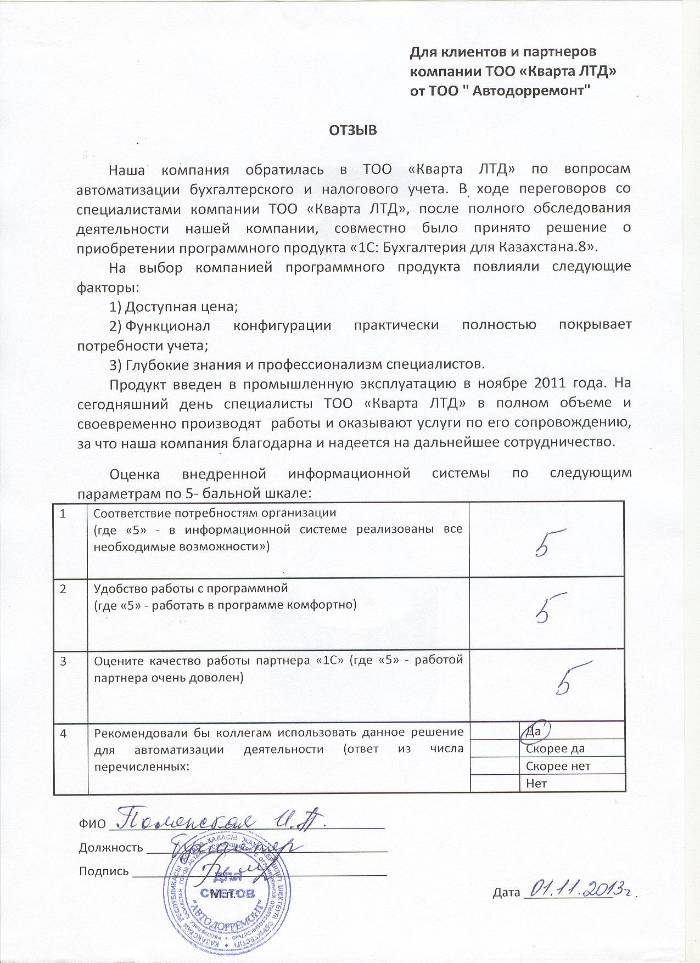 Отзыв клиента на внедренное решение