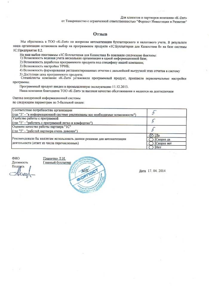 Внедренное решение: ТОО "Форпост - инвестиции и развитие" автоматизировал бухгалтерский и налоговый учёт на базе ПП "1С:Бухгалтерия 8 для Казахстана"