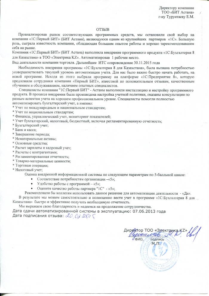 Внедренное решение: Автоматизация бухгалтерского учета в ТОО "Электрика KZ" на базе программного продукта "1С:Предприятие 8. Бухгалтерия для Казахстана"