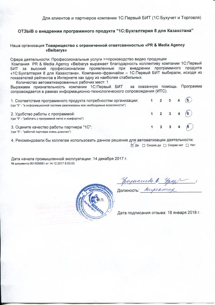 Внедренное решение: Автоматизация бухгалтерского учета на базе программного продукта "1С:Бухгалтерия 8 для Казахстана" в ТОО «PR & Media Agency «Beibarys»