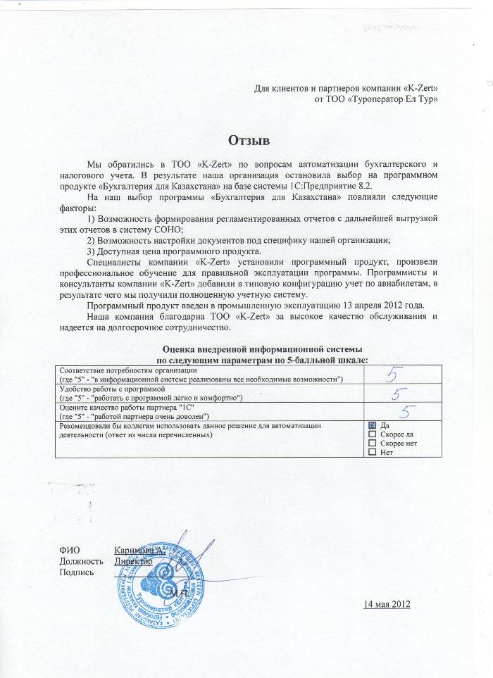 Внедренное решение: ТОО «Туроператор Ел Тур» автоматизировал бухгалтерский и налоговый учёт на базе ПП "1С:Бухгалтерия 8 для Казахстана"