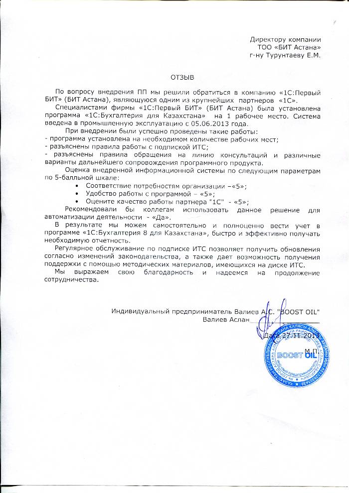 Внедренное решение: Автоматизация бухгалтерского учета у индивидуального предпринимателя Валиева А.С. "BOOST OIL" на базе программного продукта "1С:Предприятие 8. Бухгалтерия для Казахстана"