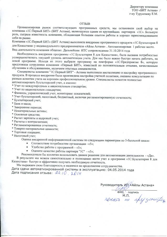 Внедренное решение: Автоматизация бухгалтерского учета у индивидуального предпринимателя Айлы Астана на базе программного продукта "1С:Бухгалтерия 8 для Казахстана"