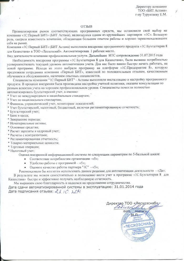 Внедренное решение: Автоматизация бухгалтерского учета в ТОО "Лесхозснаб" на базе программного продукта "1С:Бухгалтерия 8 для Казахстана"