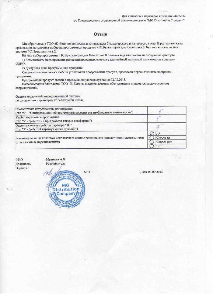 Внедренное решение: ТОО "MG Distribution Company" автоматизировал бухгалтерский и налоговый учёт на базе ПП "1С:Бухгалтерия 8 для Казахстана. Базовая версия"