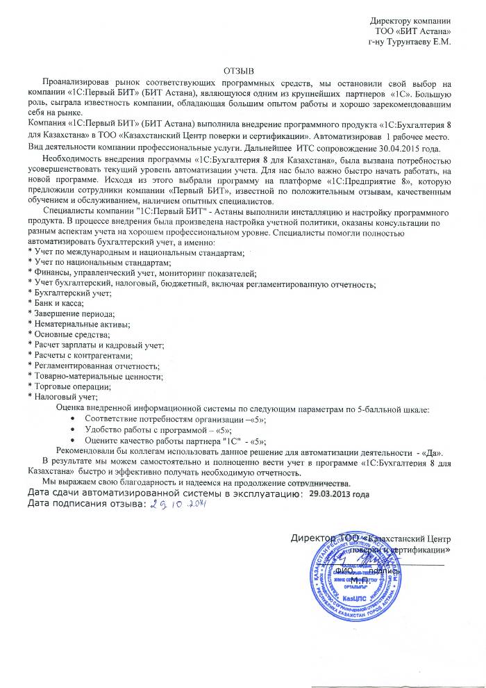 Внедренное решение: Автоматизация бухгалтерского учета в ТОО "Казахстанский Центр поверки и сертификации" на базе программного продукта "1С:Предприятие 8.Бухгалтерия для Казахстана"