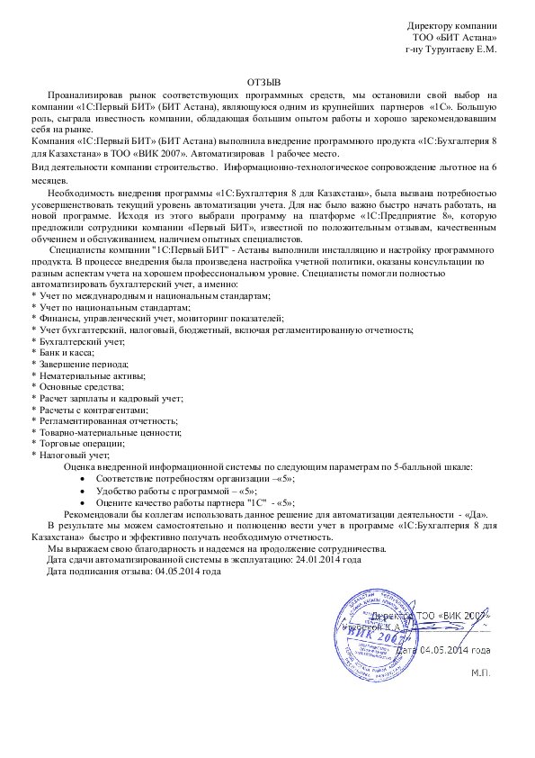 Внедренное решение: Автоматизация бухгалтерского учета в ТОО "ВИК 2007" на базе программного продукта "1С:Предприятие 8. Бухгалтерия для Казахстана"