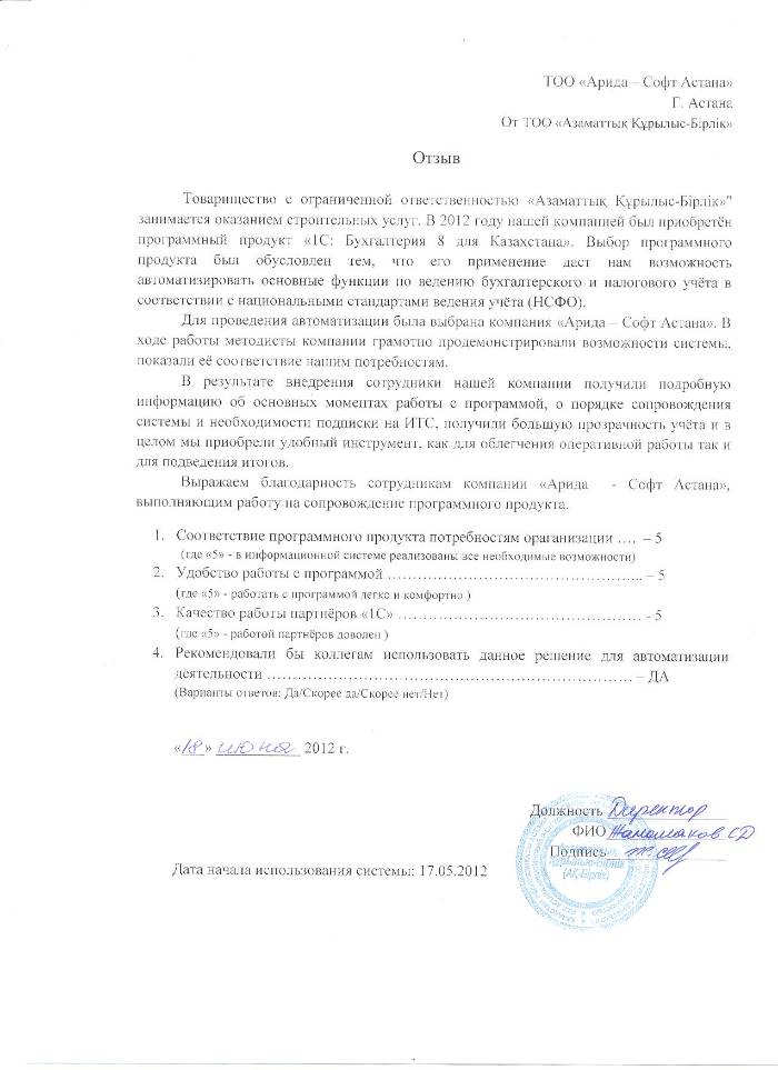 Внедренное решение: Внедрение программного продукта "1С:Бухгалтерия 8 для Казахстана" в компании, оказывающей услуги строительства