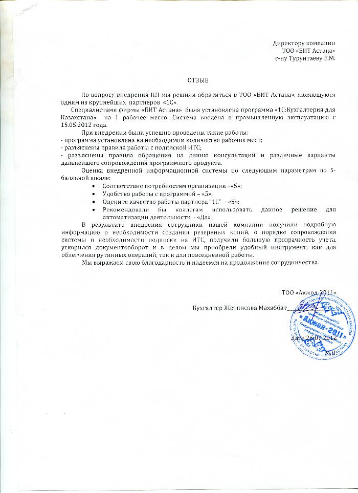 Внедренное решение: Автоматизация бухгалтерского учета в ТОО "Акжол-2011" на базе программного продукта "1С:Бухгалтерия 8 для Казахстана"