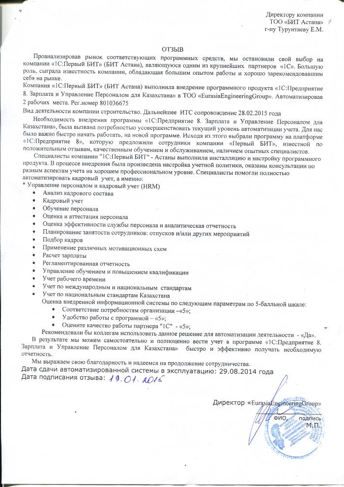 Внедренное решение: Автоматизация кадрового учета на базе программного продукта "1С:Предприятие 8. Зарплата и Управление Персоналом для Казахстана" в ТОО "EurasiaEngineeringGroup"