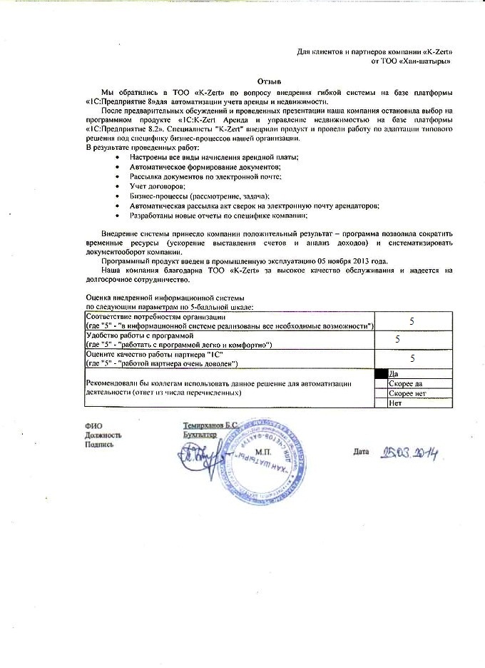 Внедренное решение: ТОО «Хан Шатыры» автоматизировал бухгалтерский, налоговый и управленческий учёт с помощью модуля "K-Zert:Аренда и Управление недвижимостью" на базе ПП "1С:Бухгалтерия 8 для Казахстана"