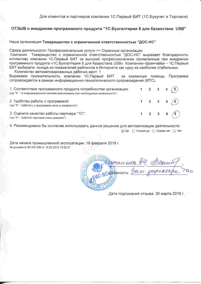 Внедренное решение: Автоматизация бухгалтерского учета на базе программного продукта "1С:Бухгалтерия 8 для Казахстана" в ТОО "ДОС-НС"