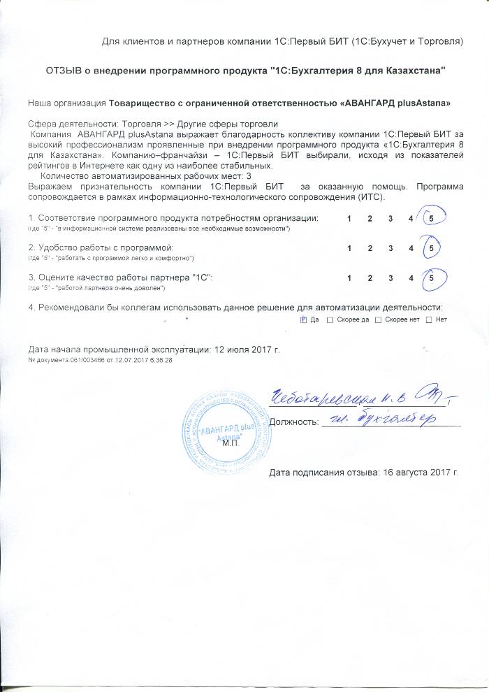 Клиент: Товарищество с ограниченной ответственностью «АВАНГАРД plusAstana»