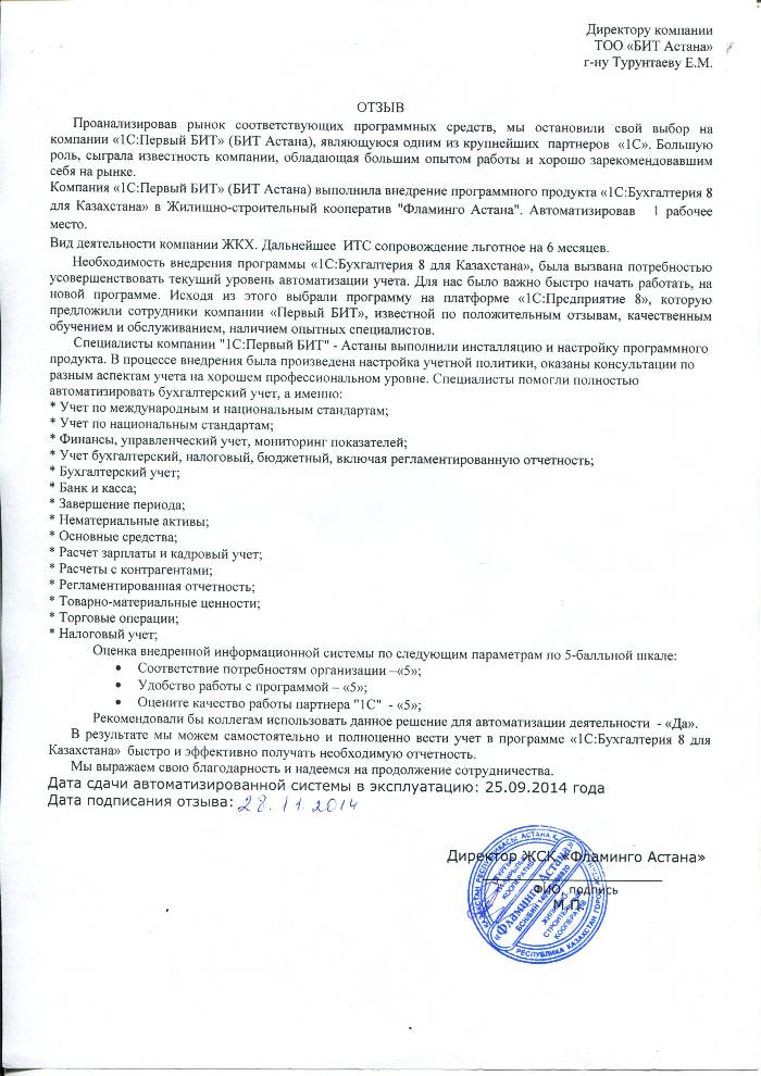 Внедренное решение: Автоматизация бухгалтерского учета в Жилищно-строительном кооперативе "Фламинго Астана" на базе программного продукта "1С:Бухгалтерия 8 для Казахстана"