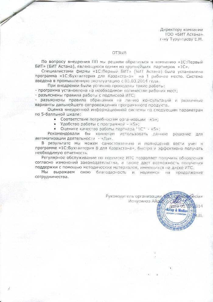 Внедренное решение: Автоматизация бухгалтерского учета в ТОО "Kitap&media" на базе программного продукта "1С:Предприятие 8. Бухгалтерия для Казахстана"