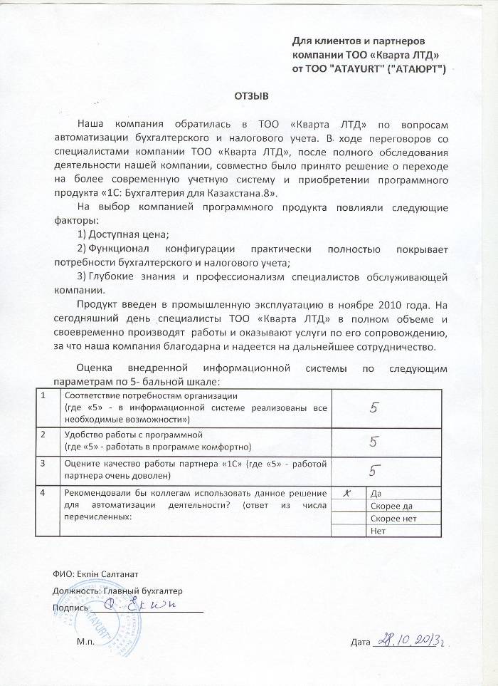 Клиент: ТОО "ATAYURT" ("АТАЮРТ")