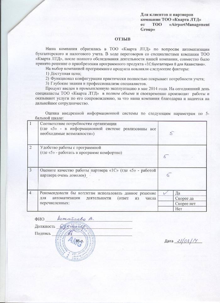 Отзыв клиента на внедренное решение