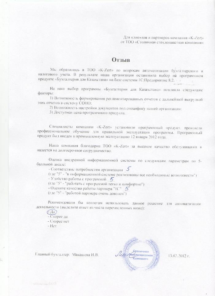 Внедренное решение: Автоматизация бухгалтерского и налогового учёта в ТОО «Столичная стеклопакетная компания» на базе ПП "1С:Бухгалтерия 8 для Казахстана"