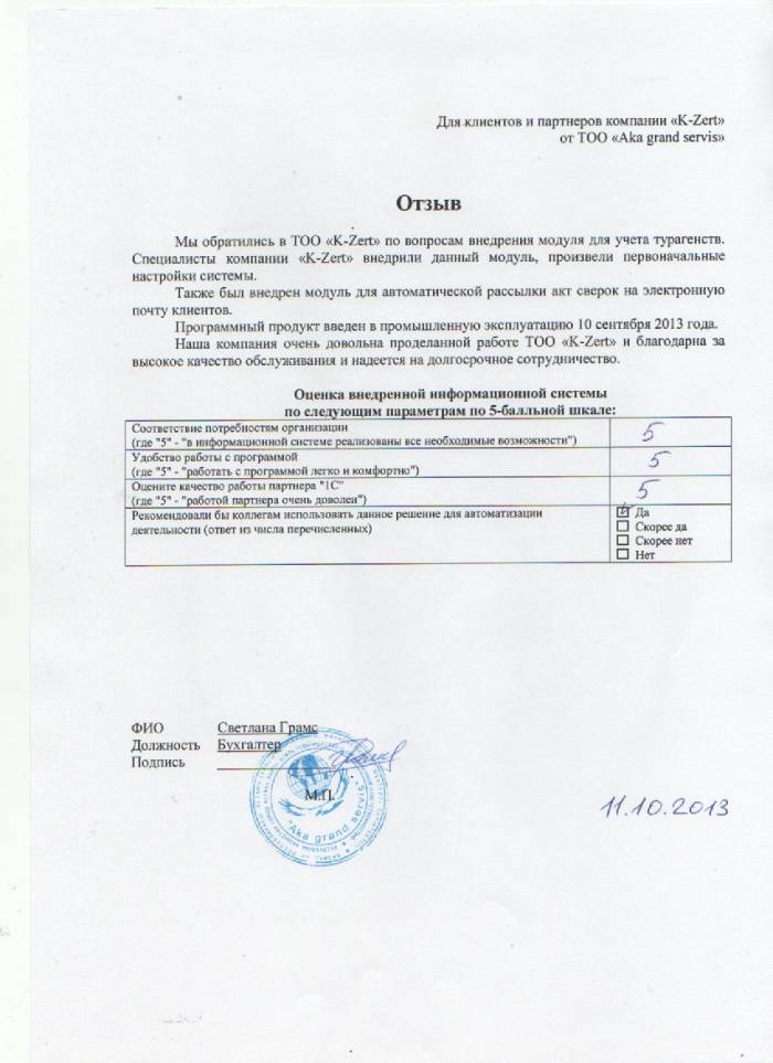 Внедренное решение: ТОО “Aka grand servis” автоматизировал учет турагенства с помощью модуля "K-Zert:Турагенства и туроператоры" на базе ПП "1С:Бухгалтерия для Казахстана"