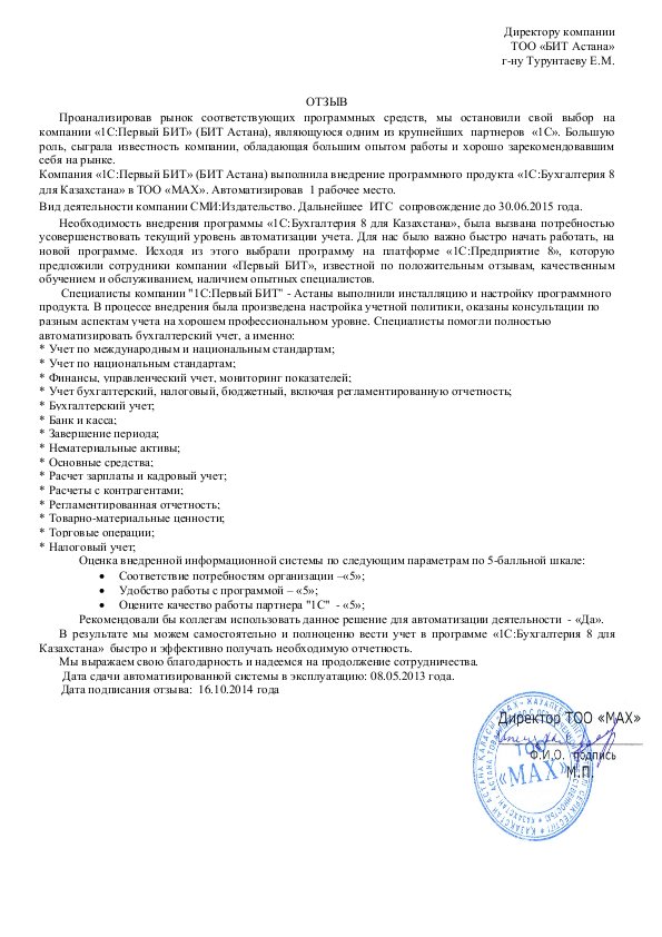 Внедренное решение: Автоматизация бухгалтерского учета в ТОО "МАХ" на базе программного продукта "1С:Бухгалтерия 8 для Казахстана"