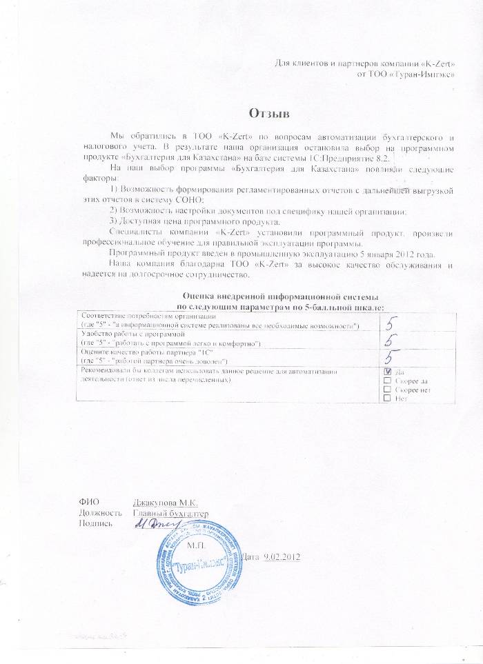 Внедренное решение: Автоматизация бухгалтерского и налогового учёта в ТОО «Туран-Импэкс» на базе ПП "1С:Бухгалтерия 8 для Казахстана"