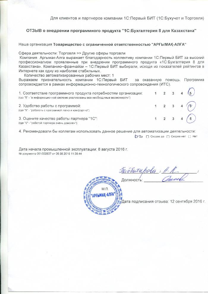 Оценка качества работы партнера "1С": 5