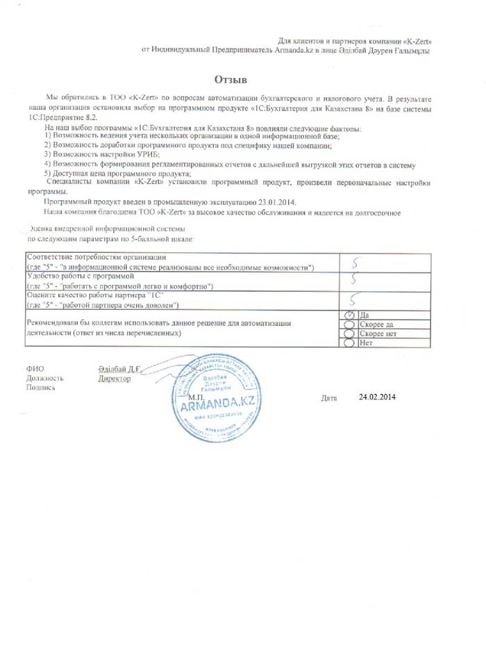 Внедренное решение: ИП Armanda.kz автоматизировал бухгалтерский и налоговый учёт на базе ПП "1С:Бухгалтерия 8 для Казахстана"